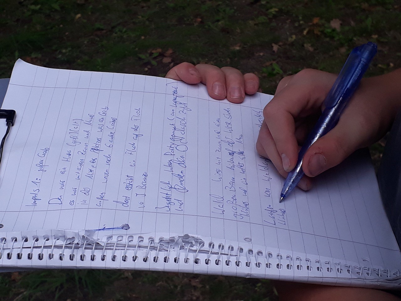 „Eigentlich haben wir Party gemacht am Lagerfeuer im Wald und plötzlich standen wir vor dem Grab. Ein langer Ast ragt in den Weg. Im Netz eine grosse schwarze Spinne. Daneben ein halbverfallener Schuppen mit einer alten Badewanne mit Wasser, in der eine Leiche schwimmt. Als wir hinein gehen, schrecken wir zurück. Das ganze Gebäude ist voller Leichen.“